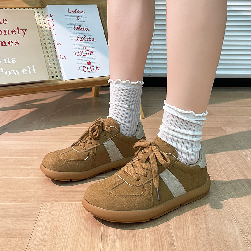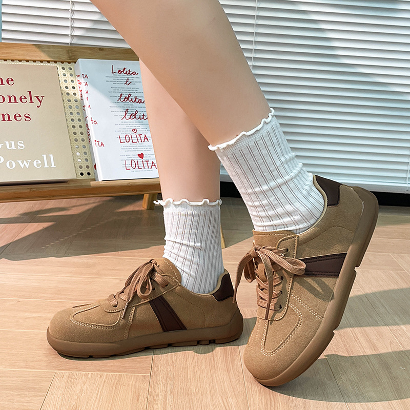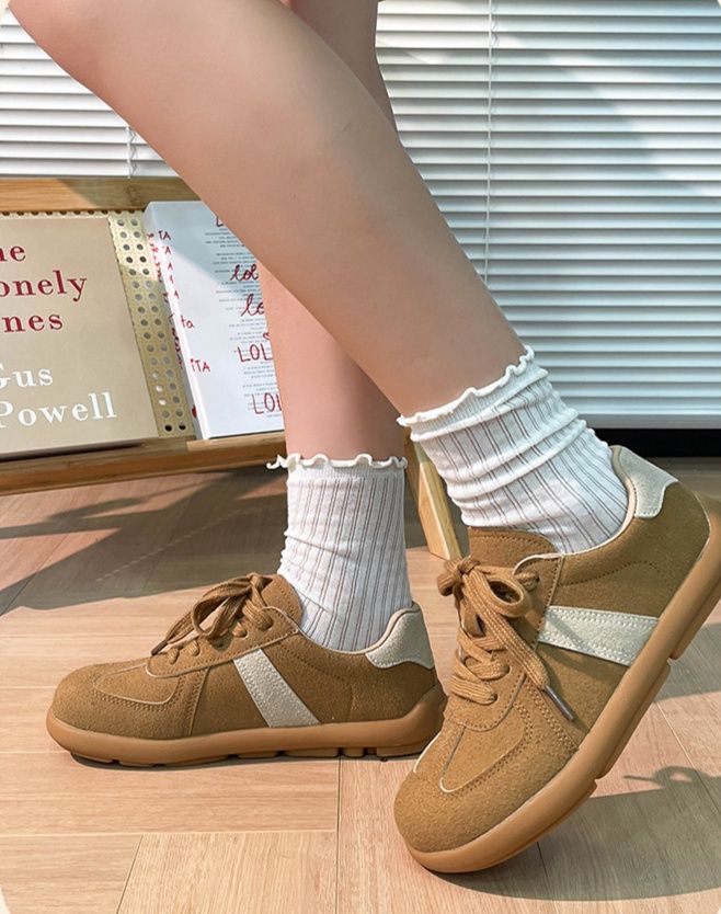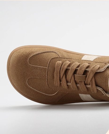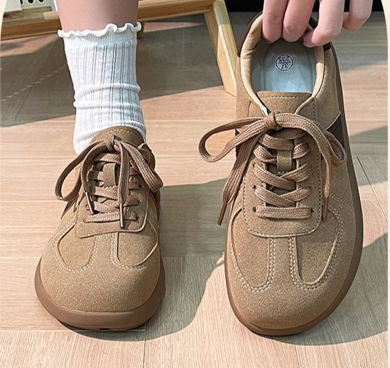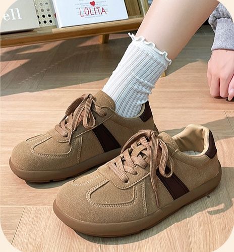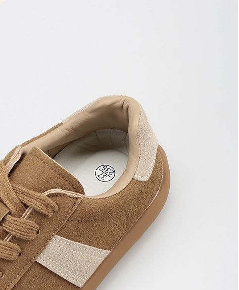 サイドに爽やかな配色ラインをあしらったスエード靴のスニーカーです。 柔らかな起毛素材が足を優しく包み込み、長時間の歩行でも快適な履き心地を実現します。 レースアップデザインでフィット感も調整可能です。 厚みのあるソールがクッション性を高め、日常使いからお出かけまで幅広いシーンで活躍します。 カジュアルなコーディネートにぴったりの一足です。