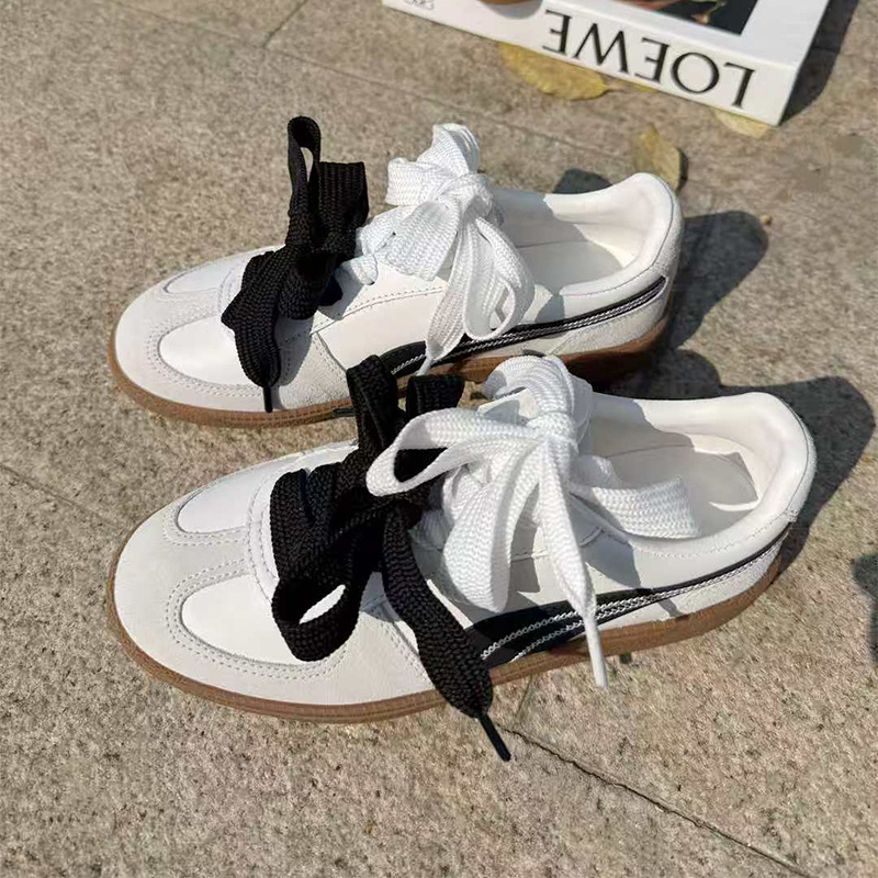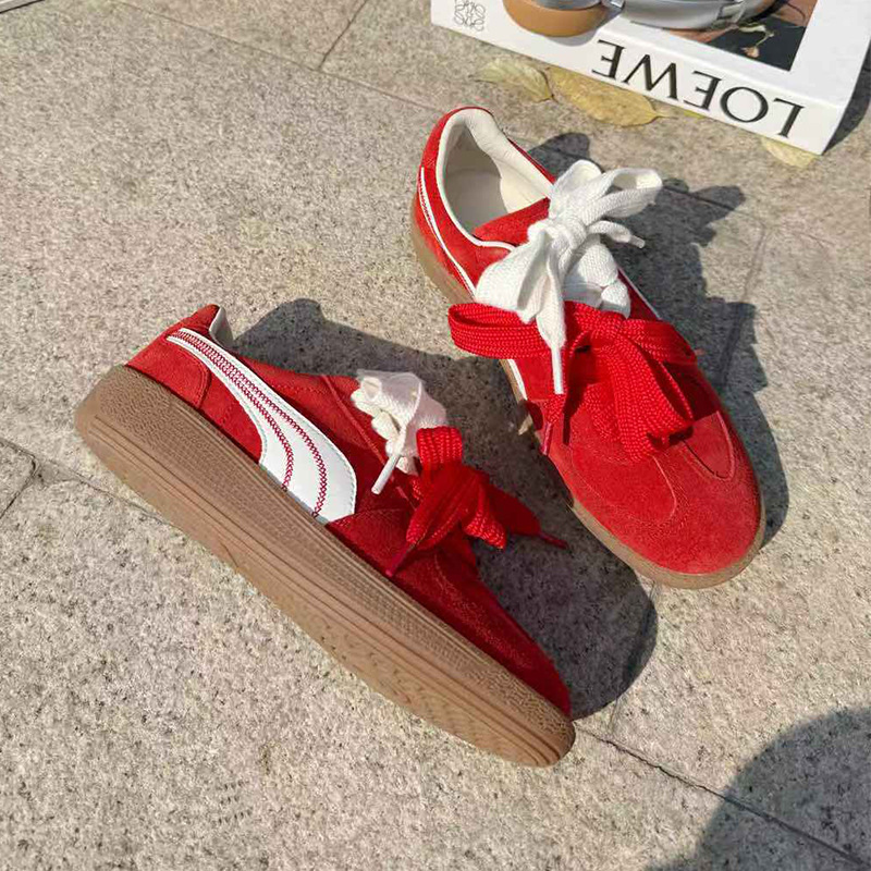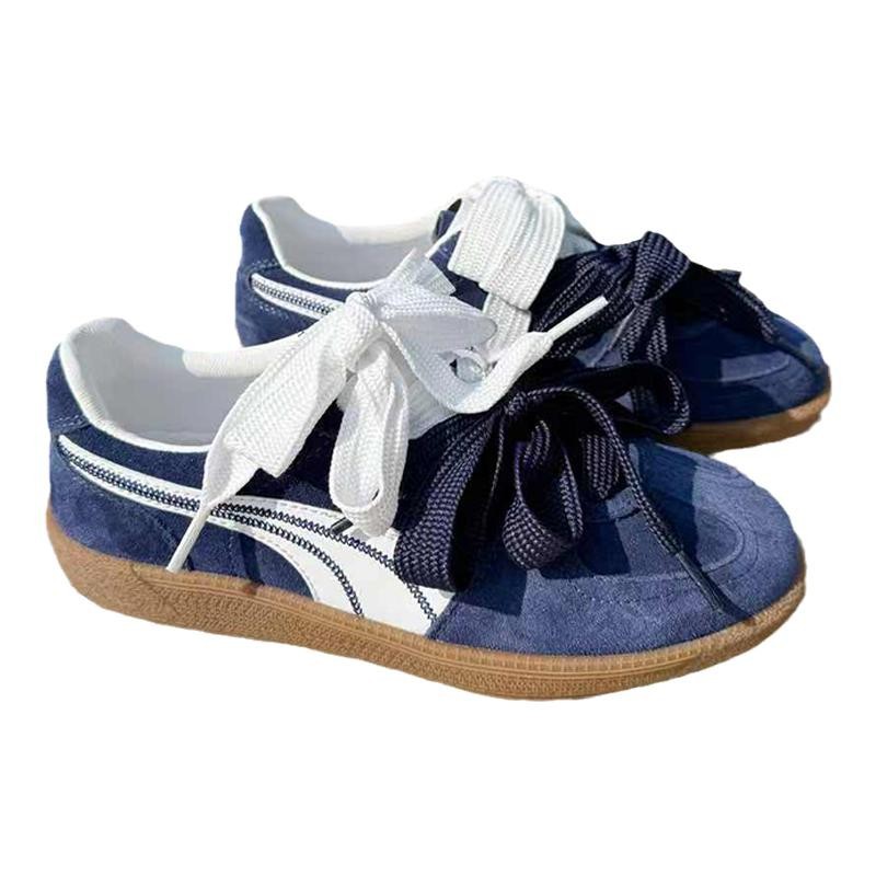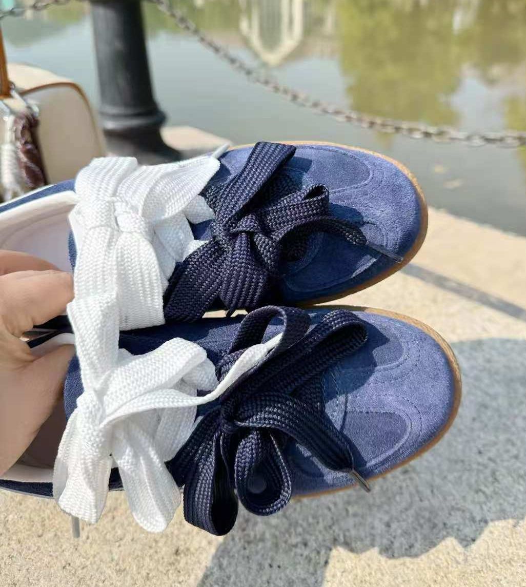 柔らかなスエード靴の質感を生かした、カジュアルで可愛らしいスニーカーです。 特徴的な幅広のリボンレースが足元を華やかに演出し、サイドの流れるようなラインデザインがスポーティな印象を与えます。 ガムソールを採用しており、履き心地とクッション性に優れた仕様となっています。 普段使いからお出かけまで幅広く活躍する、おしゃれで実用的な一足です。