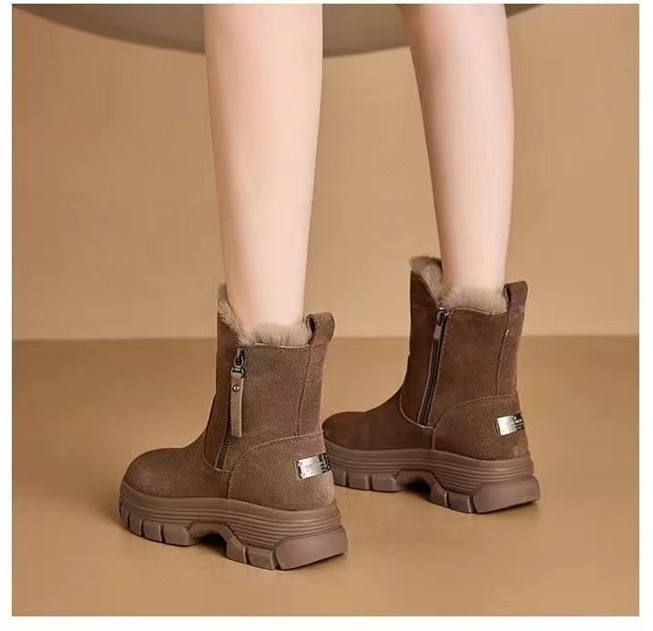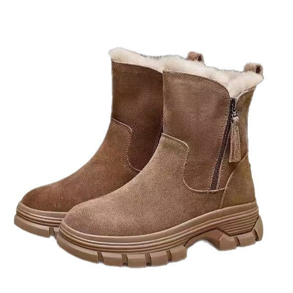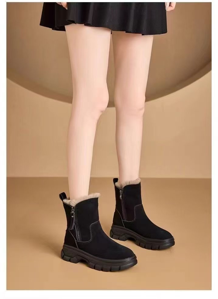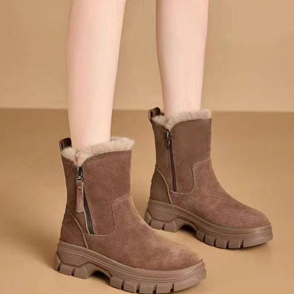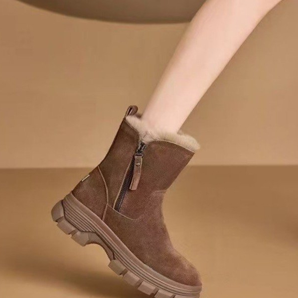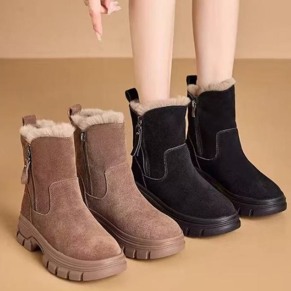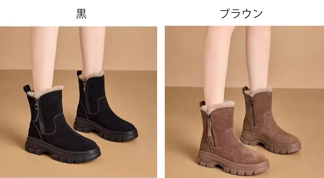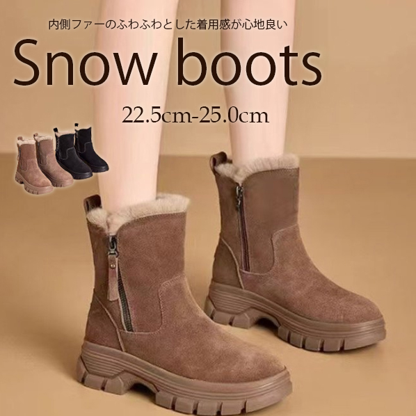 ふわふわの内側ファーで足元を暖かく包み込むスエード調のスノーブーツ。 厚底デザインで歩きやすく、サイドジップで脱ぎ履きも楽々。 スエード靴の上品な質感と機能性を兼ね備えた、冬のおしゃれを格上げする一足です。