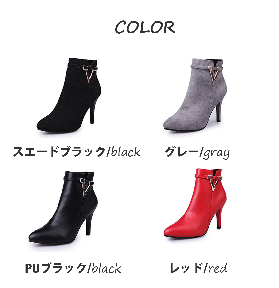 ■サイズ(単位:cm) 35(22.0~22.5cm)、36(22.5~23.0cm)、37(23.0~23.5cm)、38(23.5~24.0cm)、39(24.0~24.5cm) ■サイズについて(単位:cm) 全サイズ共通:ヒール9cm、筒高10cm ■カラー 画像に記載 ■素材 スエードブラック、グレー:スエード、合成底 PUブラック、レッド:PU、合成底 ■重量 片足300g